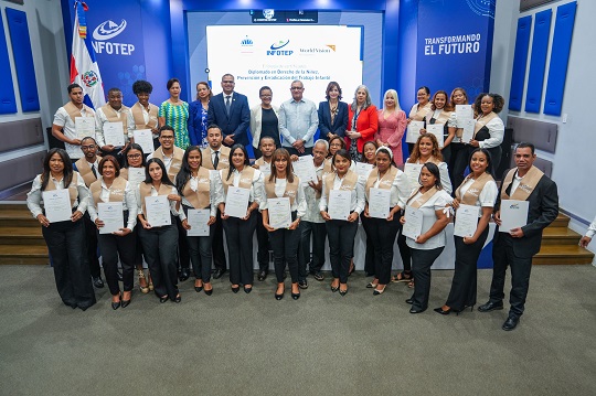 Santo Domingo. – El Instituto Nacional de Formación Técnico Profesional (INFOTEP), junto al Ministerio de Trabajo y World Vision, certificó a 47 participantes del Diplomado en Derechos de la Niñez, Prevención y Erradicación del Trabajo Infantil, impartido en las regionales Cibao Sur y Oriental.
