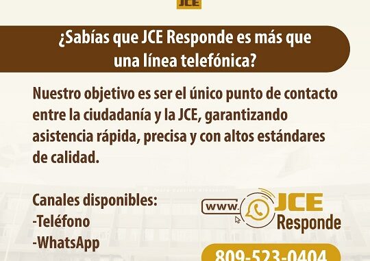 Santo Domingo. – La Junta Central Electoral (JCE), como institución encargada de administrar y custodiar la identidad de los dominicanos y extranjeros residentes en el país, tiene a disposición de la ciudadanía el “Centro de Contacto Institucional JCE Responde” con el objetivo de continuar fortaleciendo, optimizando y agilizando los diferentes servicios que ofrecemos.