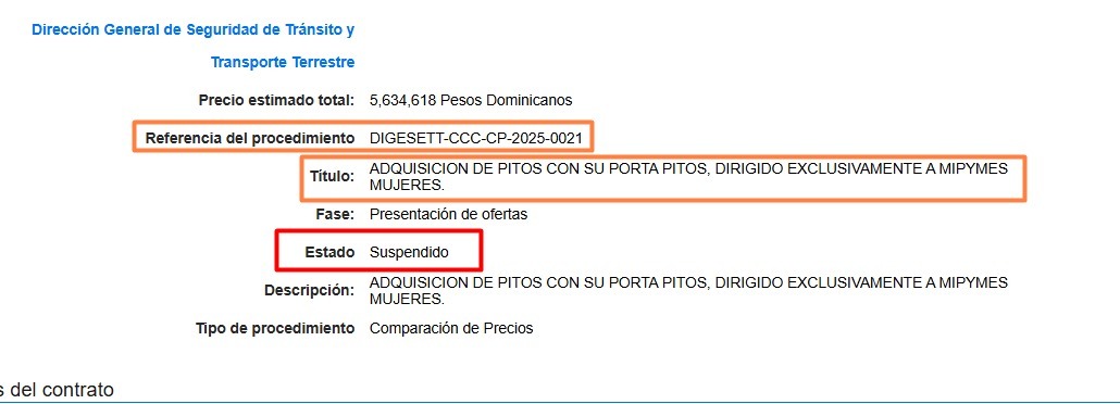 Santo Domingo R.D.- La Dirección General de Contrataciones Públicas (DGCP) dispuso este viernes la suspensión de oficio del procedimiento DIGESETT-CCC-CP-2025-0021, realizado por la Dirección General de Seguridad de Tránsito y Transporte Terrestre (DIGESETT) para la […]