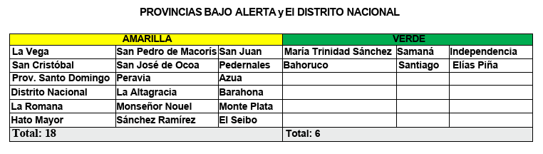 Este sistema podría convertirse en huracán. En virtud de lo anterior y lo establecido en el artículo 2 capítulo 1, de la Ley 147-02, sobre Gestión de Riesgos, este Centro de Operaciones de Emergencias, Modifica el NIVEL DE ALERTA por posibles crecidas de ríos, arroyos y cañadas, así como inundaciones repentinas o urbanas, para las siguientes provincias y El Distrito Nacional: